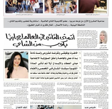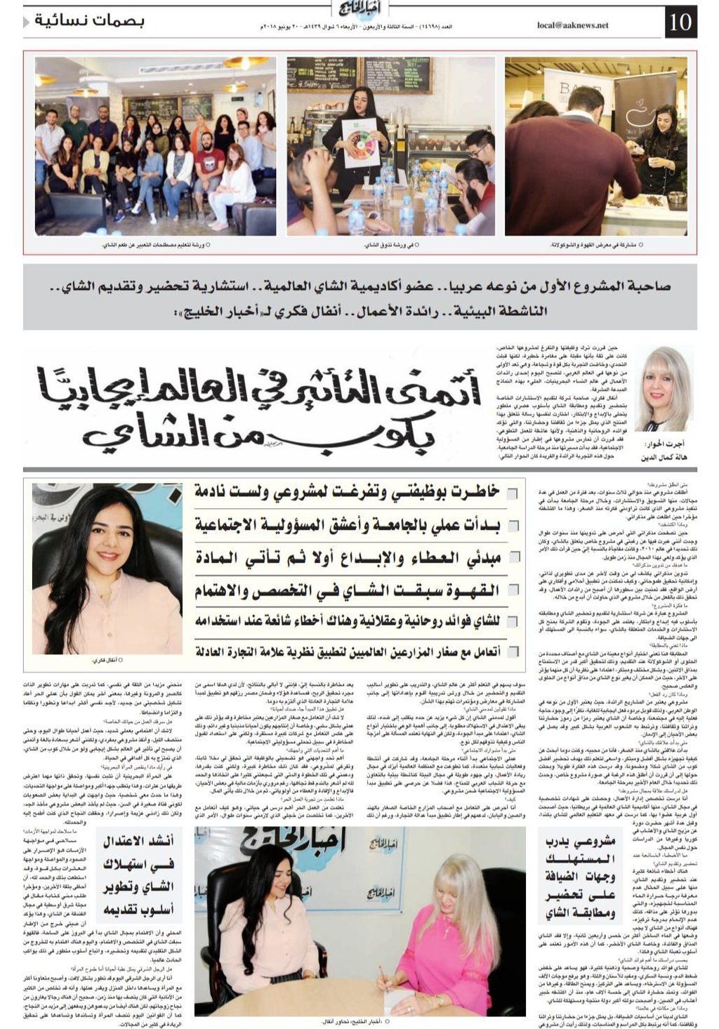 تقرير صحفي عن جميع مشاريعي المتعلقة بالشاي والنشاطات الآخرى في جريدة أخبار الخليج قسم البصمات النسائية.