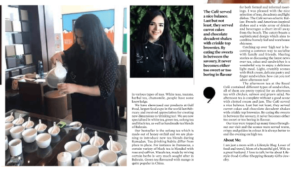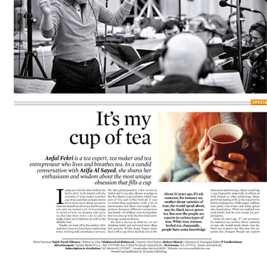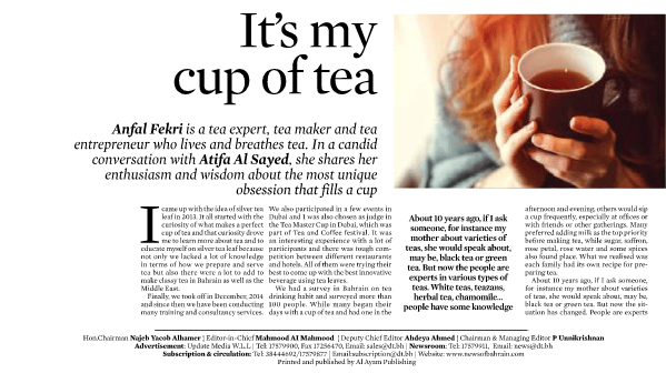 An article published in News of Bahrain (Daily Tribune) on Friday 11th of May 2018 about all the change I inspire to do in the field of tea.